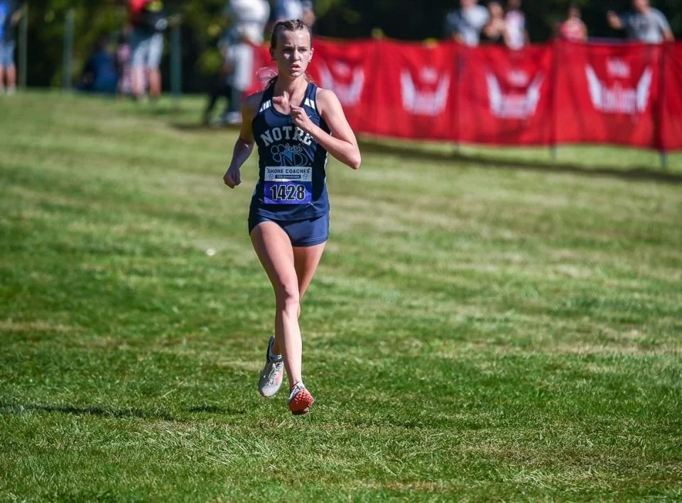 Alaina Sabo (Notre Dame) comes down the homestretch in the Varsity E race at the Shore Coaches Invitational 2025. | Tom Smith for MileSplit
