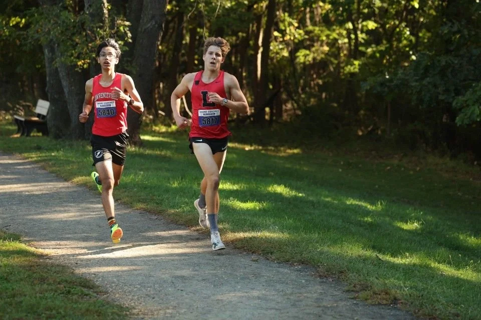 Lawrenceville’s Bastian Bocklage (right) and Arunav Sarkar (left) run together towards the front of the Varsity G race at the Shore Coaches Invitational. | Tom Harkins for MileSplit