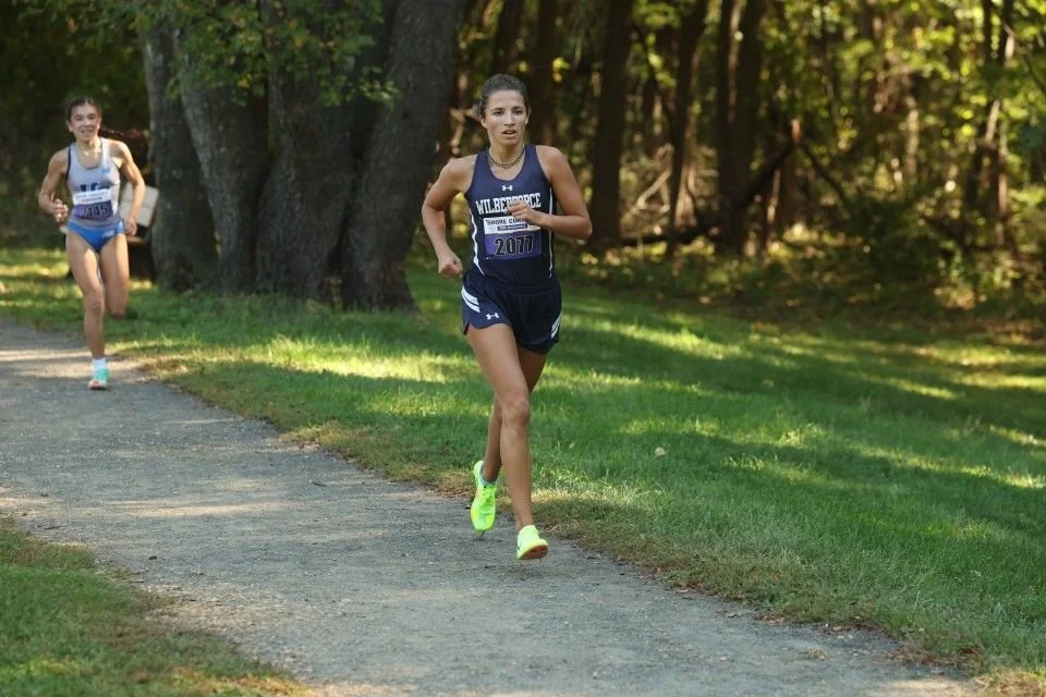 Laura Sallade (Wilberforce) races in a very competitive Varsity E division at the Shore Coaches Invitational 2025. | Tom Harkins for MileSplit