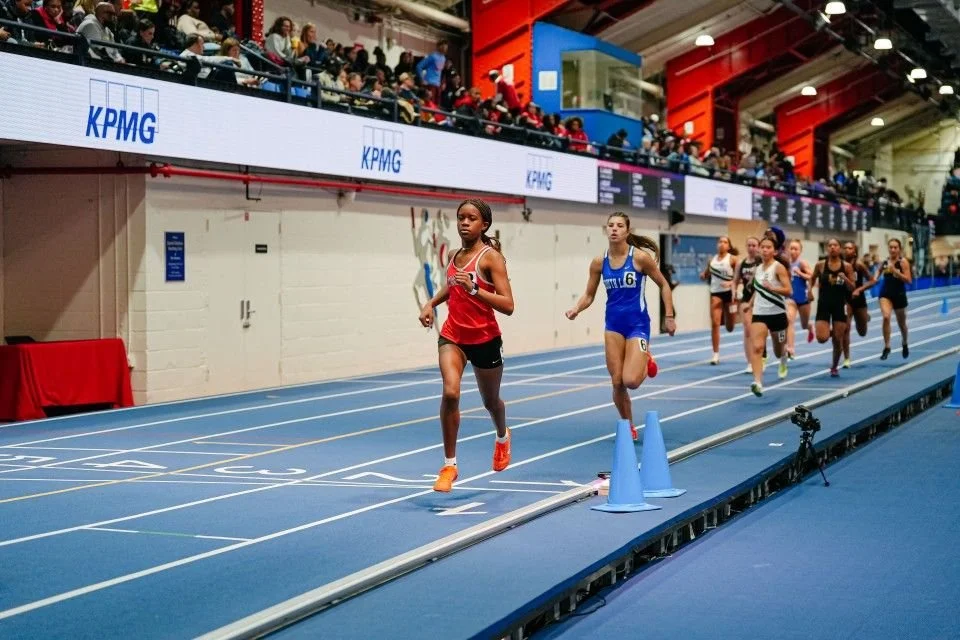 Izzy Meth (Lawrence) kicks for 2nd place in a close four-girl race in the 1600m at the Bill Bruno Holiday Classic. | Tom Smith for MileSplit